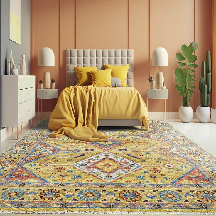 Gold rugs, symbolizing optimism and positivity, imbue spaces with a cheerful aura. Aryahita's collection of yellow rugs varies from gentle pastel shades to striking golden tones, enhancing the environment and instilling a sense of coziness. These rugs are ideally suited for spaces that seek an infusion of energy and a positive vibe. Interestingly, in color psychology, yellow is often associated with happiness, enthusiasm, and fun. It's known to stimulate mental activity and generate muscle energy, making it a popular color in creative spaces and fitness areas. Furthermore, yellow is also linked to the stimulation of the nervous system, enhancing memory and encouraging communication, making these rugs not just visually appealing, but also potentially beneficial for fostering a lively and engaging atmosphere.